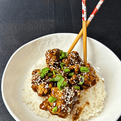 - Serve over jasmine rice and garnish with sesame seeds and green onions.